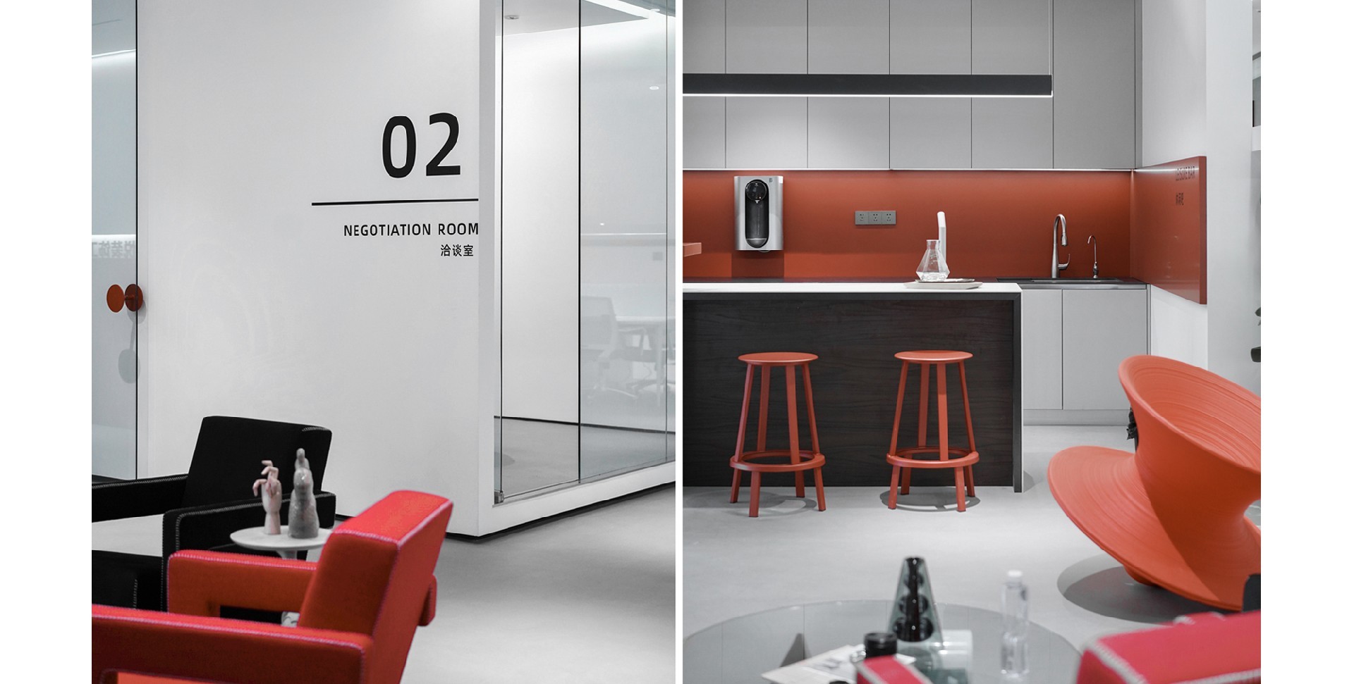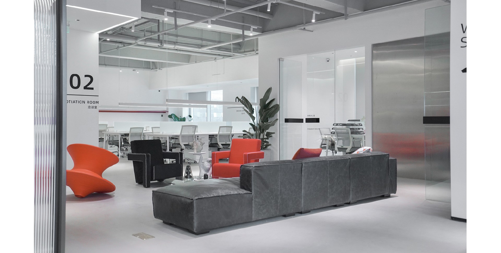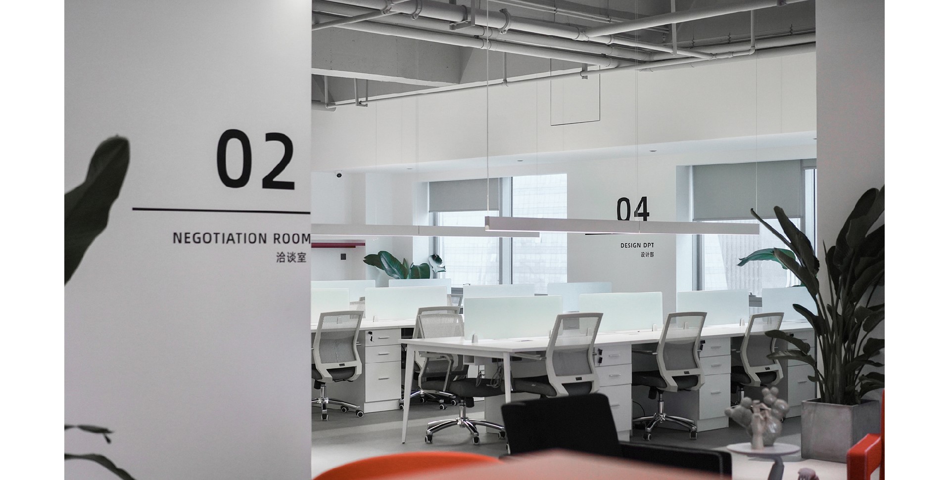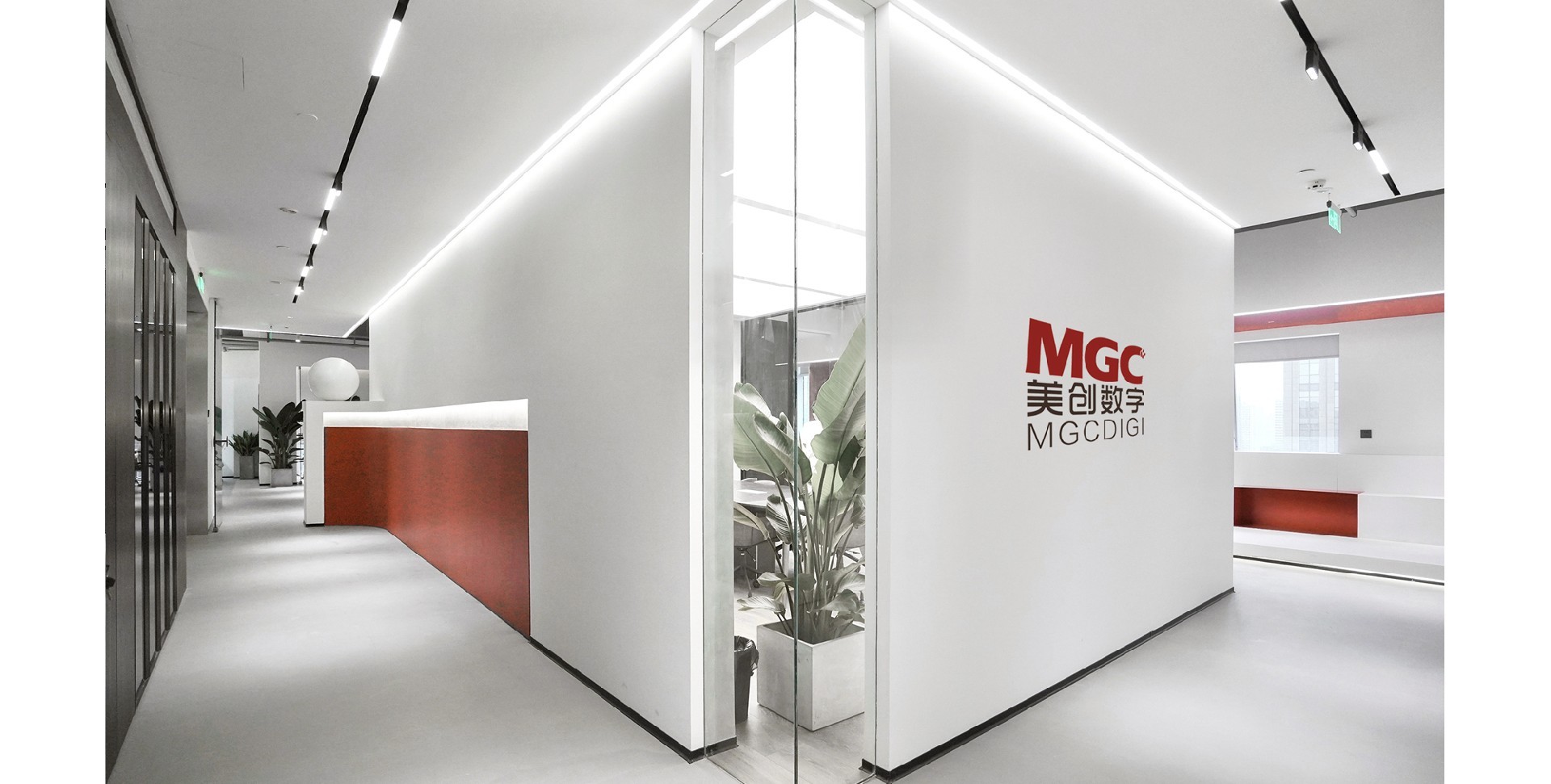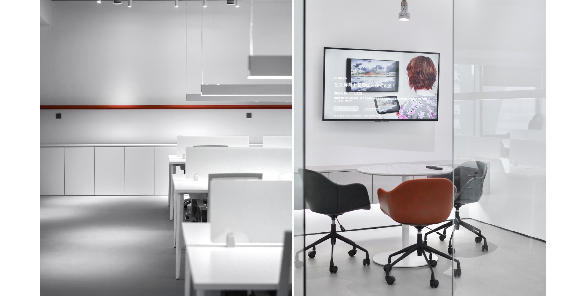 辦公室以白色和紅色為主色調,營造出簡潔而時尚的氛圍。整體布局寬敞,光線充足,展現了現代辦公環境的開放性和舒適性。強調空間的通透性和自然光的利用。為員工創造一個明亮、舒適的工作環境。